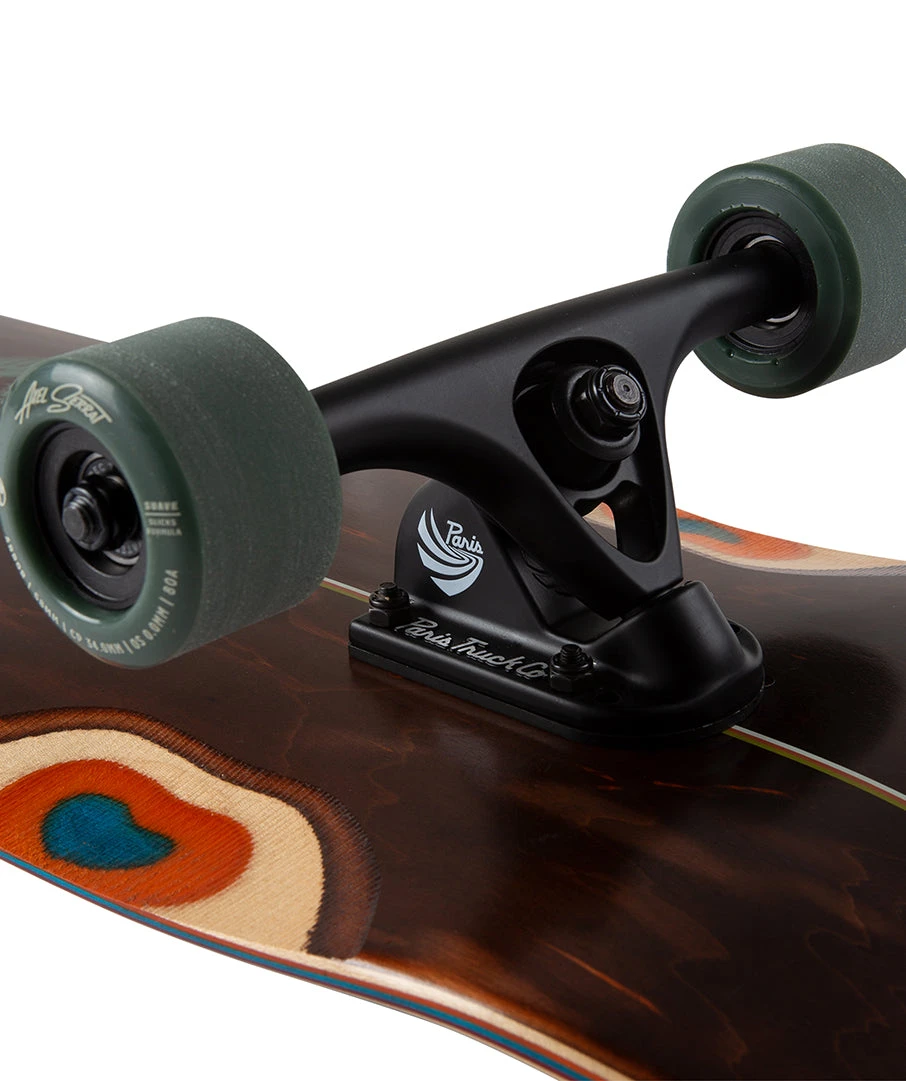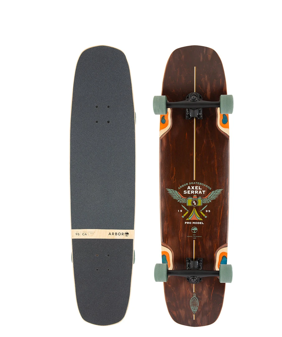 Axel Serrat’s signature shape with a mellow concave and multiple wheelbase options make this a versatile hybrid for flatground, downhill, and tricks at speed.